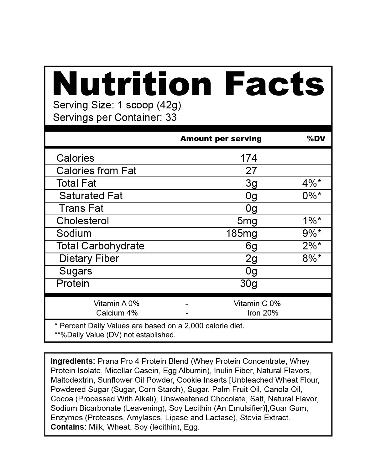 Ingredients: Whey Protein Concentrate, Whey Protein Isolate, Micellar Casein, Egg Al-bumin, Natural Chocolate Cookie and Cream Flavoring, Inulin Fiber, Natural Flavors, Maltodextrin, Sunflower Oil Powder, Guar Gum, Enzyme Matrix (Protease 1, Protease 2 Cellulase Amylase, Lactase) Stevia Extract.